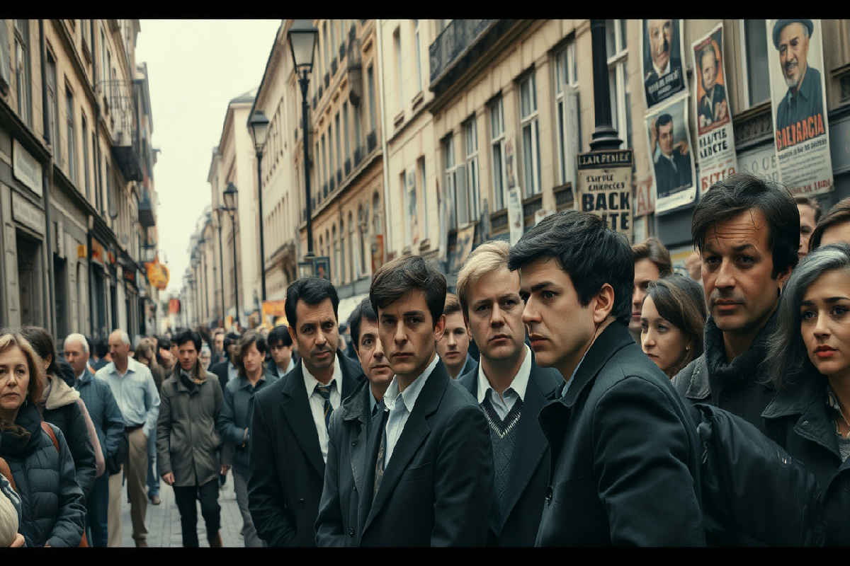 La foto ritrae un gruppo di persone in una strada di una grande città europea, con espressioni tese che raccontano una situazione tutt’altro che tranquilla. Sullo sfondo si vedono manifesti e cartelli che rimandano a un periodo denso di conflitti e trasformazioni. I volti non sono fermi, ma sembrano pronti a muoversi, a reagire: quell’attesa carica di energia trasmette tutta la tensione di quegli anni.