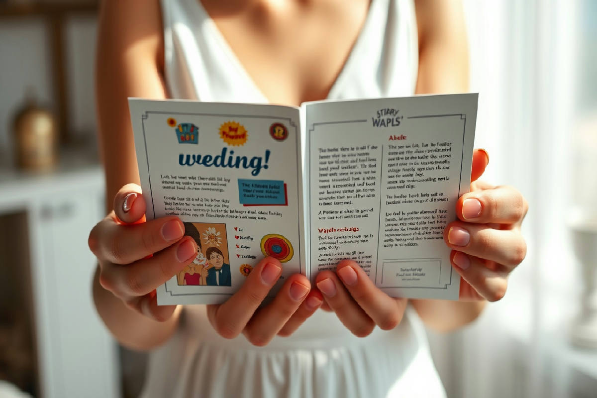 L’invito scelto da Aurora e Goffredo non è certo il solito cartoncino sobrio e formale. È piuttosto un piccolo “giornaletto” che richiama gli anni Novanta e Duemila, quelli spensierati e pieni di ricordi. Dentro c’è un po’ di tutto: informazioni pratiche, curiosità divertenti, e una serie di pagine pensate per coinvolgere chi lo riceve.
